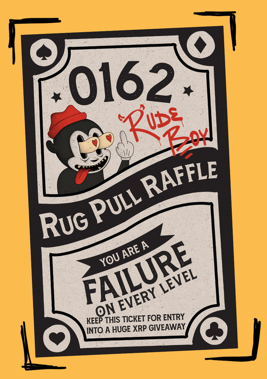 to commemorate the success of the rude boy mint we held a rug pull raffle. we created 2000 abusive NFT raffle tickets and collectible pieces of the rude journey. we gave away 2500 XRP at different milestones of the mint and a shit load of other prizes including prints, merch packs and a physical Rude boy rug. ** We still use those tickets for sporadic giveaways. **